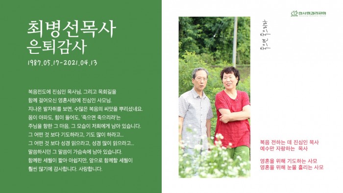 최병선 목사님 은퇴감사 예배 페이지 정보 작성자 박선재 작성일22-06-30 21:21 조회576회 댓글0건 이전글 다음글 목록 본문 댓글목록 등록된 댓글이 없습니다. 이전글 다음글 목록